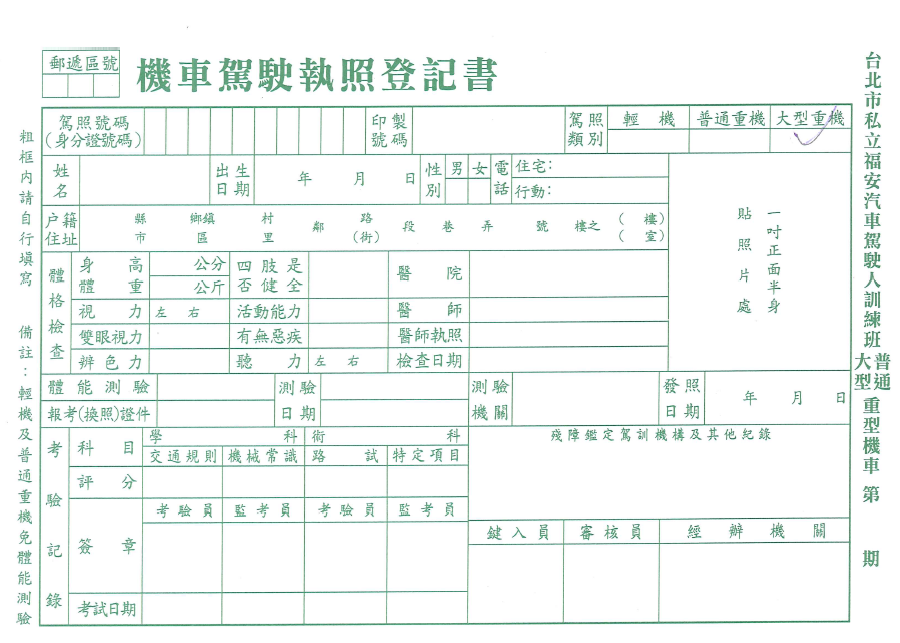 報名後請盡快向潔安領取考照申請書,於開課前至醫院或監理站進行體檢。